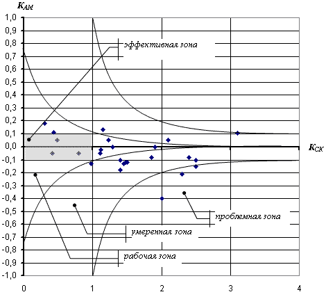 В зависимости от того, в какую из зон попадает точка с координатами (К>СК>; К>АМ>), определяется степень возможности улучшений по исследуемому показателю. Выделяем четыре зоны анализа: