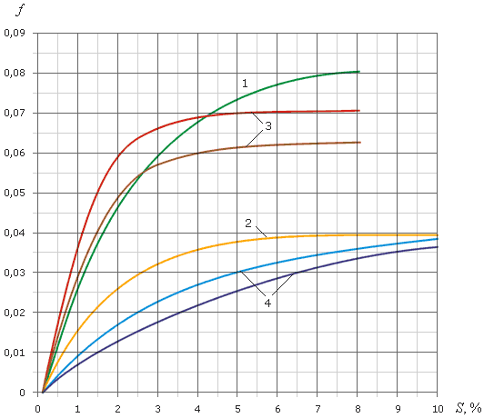 Рис. 3. Зависимость коэффициентов трения f от скольжения S