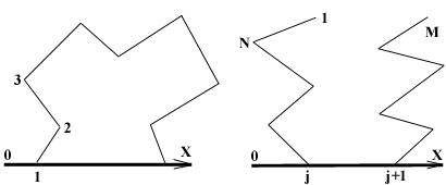 1. Разбиваем цикл на две примерно одинаковые по длине цепи (основную и рабочую), состоящие из M и L атомов соответственно (M + L = N + 2). Строим обе цепочки с помощью одного из алгоритмов построения нециклических молекул [2], обеспечивая их ориентацию относительно оси OX в соответствии с рис. 1а. б.