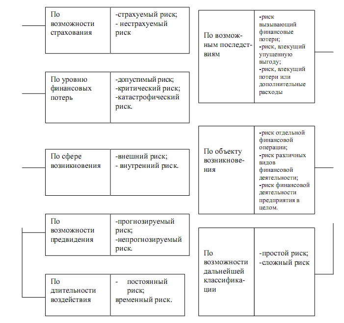 Временный риск. С данным видом риска фирма сталкивается только на отдельных этапах осуществления финансовой операции или финансовой деятельности. Временные финансовые риски в свою очередь можно разбить на две группы: краткосрочные и долгосрочные. К первой группе относятся риски, которые могут возникнуть в течение конечного известного отрезка времени (например, кредитный и инвестиционный риск). А срок возможного действия долговременных рисков оценить достоверно достаточно сложно (например, инфляционный риск).