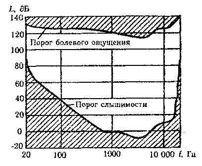 Верхняя кривая на рис. 1 соответствует порогу болевого ощущения (I = 120—130 дБ). Звуки, превышающие по своему уровню этот порог, могут вызвать боли и повреждения в слуховом аппарате.