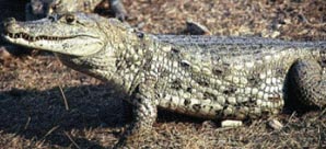 КАЙМАН КРОКОДИЛОВЫЙ (Caiman crocodilus) имеет относительно длинную, суженную впереди морду. У взрослых особей для вмещения крупных — первого и четвертого — зубов нижней челюсти (в предчелюстной кости впереди ноздрей и в области шва между предчелюстной и верхнечелюстной костями) образуются сквозные отверстия. Нередко с одной или с обеих сторон черепа разрушается наружная стенка отверстия на шве предчелюстной и верхнечелюстной костей, образуя не ямки, а вырезки в краях верхней челюсти для вмещения четвертых зубов нижней. Это придает черепу облик, обычный для черепов настоящих крокодилов, что и обусловило видовое название этого вида. В длину животные достигают 2,4—2,6 м. Крокодиловый кайман распространен в Центральной и Южной Америке: от Чиапаса на севере до устья Параны на юге, в Мексике, странах Центральной Америки, Венесуэле, Гвиане, Колумбии, Бразилии, Боливии, Парагвае, Аргентине. На этой огромной территории кайман образует 3—5 подвидов. К солоноватой воде относится терпимо, что позволило ему расселиться с континента Америки на некоторые близкие к материку острова: Тринидад, небольшие острова Горгона и Горгонилла у западных берегов Колумбии. Крокодиловых кайманов встречали иногда в море поблизости от берегов. В распространении этих животных большую роль играют плавучие острова, образующиеся из водяных гиацинтов (Eichhornia) и других растений, достигающие иногда значительных размеров (свыше 900 м²) и часто сплывающие вниз по течению рек. Эти плавучие острова («маты») дают убежище молодым кайманам и могут переносить их на большие расстояния и в открытое море. Животные предпочитают тихие воды и чаще встречаются в болотах и небольших речках. Молодые особи питаются главным образом водными насекомыми. Взрослые нападают на любую добычу, с которой могут справиться. Основная пища состоит из крупных водяных улиток, пресноводных крабов и рыбы. Размножаются в течение круглого года, но особенно интенсивно с января до марта (Колумбия). Самки для кладки яиц сооружают гнезда из гниющих растений среди зарослей вблизи воды. Кладка состоит из 15—30 яиц. Взрослые самцы занимают определенную территорию и дерутся с самцами, нарушившими границы индивидуальных участков. Численность крокодиловых кайманов в настоящее время сильно упала из-за интенсивной охоты на них ради кожи.