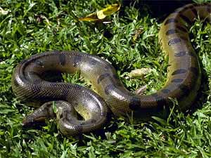 АНАКОНДА (Eunectes murinus) крупнейшая в мире змея — населяет всю тропическую Южную Америку к востоку от Кордильер и остров Тринидад. Средние размеры взрослой анаконды — 5—6 м, но изредка встречаются особи до 10 м длиной. Уникальный по величине достоверно измеренный экземпляр из Восточной Колумбии достигал 11 м 43 см (упомянем, однако, что сохранить этот экземпляр не удалось). Основная окраска туловища анаконды серовато-зеленая с крупными темно-бурыми пятнами округлой или продолговатой формы, чередующимися в шахматном порядке. По бокам туловища идет ряд мелких светлых пятен, окруженных черной полосой. Такая окраска великолепно скрывает анаконду, когда она затаивается, лежа в тихой заводи, где по серо-зеленой воде плавают бурые листья и пучки водорослей. Излюбленные места анаконды — слабопроточные рукава и заводи, старицы и озера, заболоченные низины в бассейнах рек Амазонки и Ориноко. В таких укромных уголках анаконда, лежа в воде, сторожит свою добычу различных млекопитающих, приходящих на водопой (агути, пака, пекари), водоплавающих птиц, иногда черепах и молодых кайманов. Жертвой анаконды оказываются также домашние свиньи, собаки, куры, утки, когда они приближаются к воде. Анаконда нередко выползает на берег и принимает солнечные ванны, но далеко от воды не отходит. Она прекрасно плавает, ныряет и может подолгу находиться под водой, при этом ноздри ее замыкаются специальными клапанами. При пересыхании водоема анаконда перебирается в соседние или спускается вниз по течению реки. В засушливый период, который может наступить в некоторых районах, анаконда зарывается в донный ил и впадает в оцепенение, в котором остается до возобновления дождей. Процесс линьки у анаконды также часто проходит под водой: в неволе приходилось наблюдать, как змея, погрузившись в бассейн, трется брюхом о его дно и постепенно стягивает с себя выползок. Анаконда яйцеживородяща, и самка приносит от 28 до 42 детенышей длиной 50—80 см, но изредка может откладывать яйца. В неволе живут недолго — 5—6 лет, максимальная продолжительность жизни в неволе — 28 лет. Основным кормом анаконде служат кролики, морские свинки, крысы, но она поедает также различных рептилий, рыб и иногда заглатывает змей. Однажды 5-метровая анаконда задушила и съела 2,5 метрового темного питона, на что ей понадобилось всего 45 минут. Вопреки многочисленным «страшным» рассказам «очевидцев», анаконду нельзя признать опасной для взрослого человека. Единичные нападения на людей совершаются анакондой, видимо, по ошибке, когда змея видит под водой только часть тела человека или если ей кажется, что на нее хотят напасть или отнять ее добычу. Вполне достоверен лишь приводимый Р. Бломбергом случай гибели тринадцатилетнего мальчика, проглоченного анакондой. Местные охотники, как правило, не боятся анаконду и при любой возможности убивают ее. С этой змеей связан ряд мифов и суеверий, бытующих среди индейских племен.