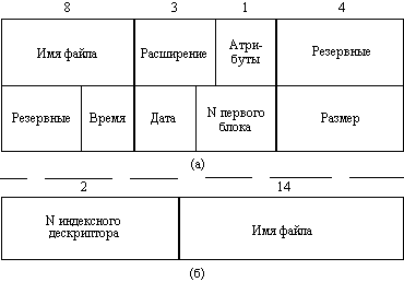 Рис. 1. Структура каталогов: а - структура записи каталога MS-DOS (32 байта); б - структура записи каталога ОС UNIX