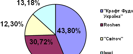 Наприклад, за 8 місяців 2007 року, по даним асоціації «Укркондитер», в Україні випущено 20,5 тис. т шоколаду. З них ЗАО «Крафт Фудз Україна» виготовило 8984 т шоколадних плиток, що складає близько 43,8% , Київська фабрика К. Маркса за цей же період виготовила 6297 т шоколадної плитки, що склало близько 30,72% від загального об`єму виробництва (див. Рис1.2)
