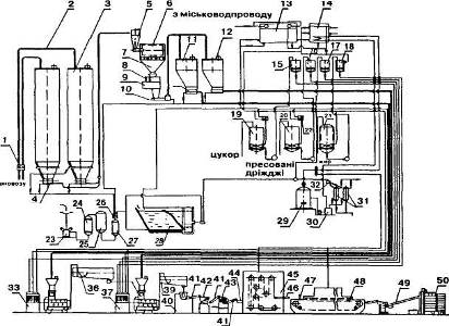Вода из городского водопровода поступает в баки холодной 13 и горячей 14 воды, из которых подается в водомерные бачки 22. Вода для питания парового котла 29 предварительно пропускается через аппараты установки для химводоочистки 30-32. Пар из парового котла привстает к расстойному шкафу и печи, а также подается в баку 14 для подогрева воды. Для замешивание опары в тестомесильную машину беспрерывного действия 34 подается мука, дозирующей станцией 33 отмерится остаток сырья с сборных емкостей. Из тестомесильной машины опара лопастным насосом 35 подается в емкость для брожения 36. Выброженная опара поступает в машину для замешивания теста 38, туда же дозирующей станцией 37 подается вода, соль и прочие компоненты, предусмотренные рецептурой. Тесто выбраживает в емкости для брожения 39 над тестоделителем 40. Из тестоделителя в виде шматов определенной массы тесто ленточным транспортером 41 направляется в округлитель 42, а потом – в тестозакаточную машину 43. Далее составителем 44 тестовые заготовки загружаются у колыбели расстойного шкафа 45. После выстаивания они с помощью пересадочного механизма 46 подаются на под конвейерной печи 48, надрезаются цилиндрическим ножом 47 и поступают в пекарную камеру.