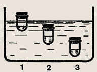 В сосуде с водой (при комнатной температуре) плавает пробирка (рис. 186). Останется ли пробирка на такой же глубине, если воду слегка подогреть; охладить? (Увеличение объема пробирки при нагревании и охлаждении не учитывать. Охлаждение производить при температуре не ниже 4 °С.)