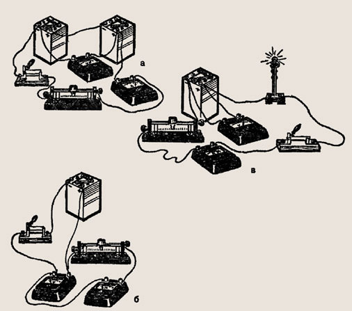 На панели укреплены три патрона с электрическими лампами. Начертите схему соединения клемм ламп между собой и полюсами источника тока так, чтобы лампы были соединены параллельно; последовательно; две параллельно, а третья последовательно с ними.