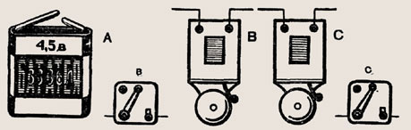 На рисунке 335 показаны батарея A, два звонка В и С и два выключателя в и с. Начертите, как должны быть соединены они проводами, чтобы выключатель в управлял звонком В, а выключатель с — звонком С.