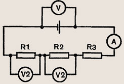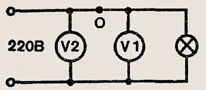 При замкнутой цепи вольтметр V2 (рис. 338) показывает 220 В. Каким станет показание этого вольтметра, если в точке О произойдет разрыв цепи? Каким было показание вольтметра V1 до обрыва цепи? Каким станет показание вольтметра V1 после обрыва цепи?