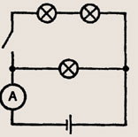 Начертите схему цепи, состоящую из источника тока, трех ламп, включенных параллельно, амперметров, измеряющих силу тока в каждой лампе и во всей цепи, и выключателя, общего для всей цепи.