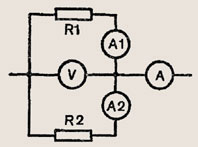 Амперметр А (рис. 343) показывает силу тока 1,6 А при напряжении 120 В. Сопротивление резистора R1 = 100 Ом Определите сопротивление резистора R2 и показания амперметров А1 и А2.