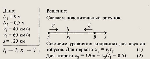 Второе тело находится в движении на 0,5 ч меньше первого, поэтому (t1 — 0,5) ч — это его время движения. Так как в месте встречи тела имеют одинаковые координаты и время встречи одинаковое, то, приравняв уравнения (1) и (2), найдем время движения автобусов до встречи и, подставив его в уравнение (1), найдем расстояние места встречи от точки А.