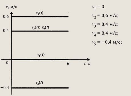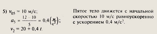 Для тела 5: v5 = (8 м - 10 м): 5 с = -0,4 м/с, т. е. тело движется навстречу телам 1, 2, 3 и 4.